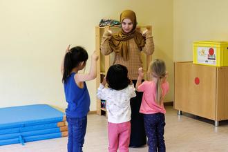 Pädagogik-Studentin Nurdan Aydin in der Kita Sonnenschein: Vormachen, Nachmachen, Nachsprechen und Bewegung hilft beim Sprechenlernen.