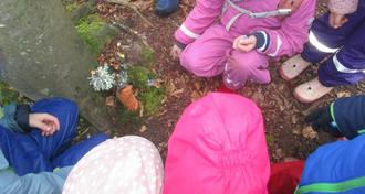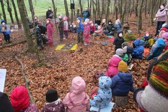 Nach der Stärkung trafen wir uns gemeinsam mit allen Kindergartenkindern und Pastoralreferent Matthias Scherer auf dem Waldplatz der Sternschnuppen.