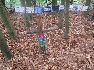 Die Ostergeschichte vom Chamäleonvogel hängt noch ein paar Tage nach Ostern aus. Mit bunten Federn haben die Kinder ein kl. Holzkreuz geschmückt, das sie beim letzten Waldtag mit ihren Eltern gebastelt hatten