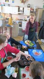 Sechs Kinder nahmen sogar an beiden Veranstaltungen teil. Dies war möglich, da die Kunst-Aktion am Vormittag und das Backen am Nachmittag stattfand. Für kleine, gesunde Stärkungen, sodass Künstler*innen und Bäcker*innen tatkräftig an ihren Gestaltungen arbeiten konnten, sorgte frisches Obst und Gemüse von der Vitaminscheune in Marienrachdorf.