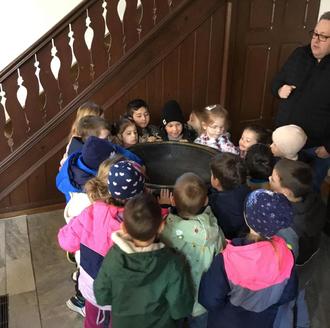 Als Nächstes kamen wir zum Taufbecken. Pfarrer Weber erklärte uns, dass hier Babys, aber auch größere Kinder und Erwachsene getauft werden. Er selbst habe in der vergangenen Woche zwei Kommunionkinder taufen dürfen. Uns wurde genau gezeigt, wie die Taufe durchgeführt wird.