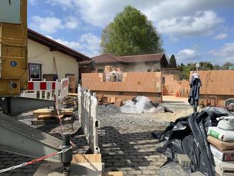 Die Erweiterung des Kindergartens wird seit dem Aufbau des Krans und dem Erstellen der Außenwände langsam auch von weitem sichtbar.