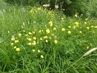 Blühaspekt der gefährdeten Trollblume (Trollius europaeus).
