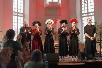 Marion Meuer, Geschäftsführerin des Kulturkreises der VG Selters begrüßte, in Vertretung für Uli Schmidt, die Zuhörerinnen und Zuhörer in der Ev. Kirche Selters zum Konzert mit der ukrainischen Band „Yagody“. Das sechsköpfige Ensemble (vier Frauen mit Federkopfputz und zwei Männer) weckte mit ihrer Musik von Anfang an die Lust zu klatschen, mit den Füßen zu wippen und die Melodien mitzusingen.