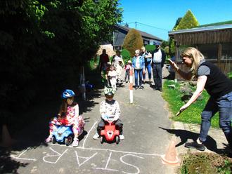 Ausgestattet mit einer Schatzkarte und den Hinweispfeilen ging es in Gruppen durch das Dorf. Ein Schatz sollte gefunden werden, dafür gab es einige Aufgaben zu erledigen. So machten sich Großeltern und Kinder auf den Weg. Es wurden Zauberblüten zu Wasser gelassen, am Schenkelberger Spielplatz wurde nach Goldtalern gegraben und kurz vor dem Ziel wartete noch ein rasantes Bobby-Car-Rennen auf die Kinder.