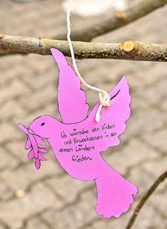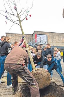 Nachdem der Baum fest in seinem Loch stand, lasen die Kinder noch ihre Wünsche vor, die sie zuvor auf bunte Friedenstauben geschrieben und am Baum befestigt hatten. Sie hatten sich zuvor schon im Religionsunterricht mit dem Thema Frieden beschäftigt. Abschließend wurde der Baum von der Baumschule Hebel, die auch den Baum aufgezogen und angeliefert hatte, gegen Wind abgesichert.