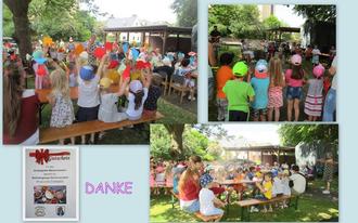 Bei einer Mitmachgeschichte rund um ein leckeres Frühstück bei den Großeltern mit Honig und Honigbrötchen hatten die Senioren und die Kinder viel Spaß. Anita Radermacher übergab den Kindern zum Abschied im Namen aller Senioren eine Spende für ein gesundes Frühstück. Jetzt können die Kinder in ihrem Kinderparlament überlegen, was zu diesem besonderen Frühstück nach den Sommerferien angeboten wird. Die Kinder und das Team bedanken sich bei allen Senioren und den Helfern für den gelungenen Nachmittag im Pfarrgarten.