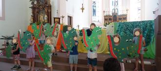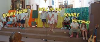 Mit diesem Lied und dem Musical „Bobby Hase will in die Schule – unbedingt …“ haben die Dinos 2025 ihren Abschiedsgottesdienst gefeiert. Eltern, Großeltern, die künftigen Lehrer und die Kindergartenkinder konnten teilnehmen und Bobby Hase mit seinen Freunden auf dem Weg in die Waldschule begleiten. Die Schulanfänger 2025 haben mit ihrem Spiel gezeigt, dass sie viel von den Tieren in der Geschichte gelernt haben und nun fit für die Schule sind.