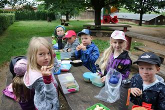 Um 16.00 Uhr ging es dann mit dem Bus zurück in die Kita. Hier warteten bereits die Eltern. Sie hatten den Spielplatz sehr schön für einen gemütlichen Grillnachmittag hergerichtet, und auf dem Grill brutzelten schon Würstchen, Steaks und Baguette. Nach dem gemeinsamen Essen und einem Eis zum Abschluss, ging ein aufregender Tag zu Ende.