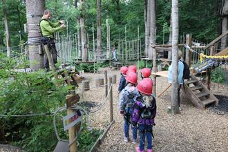 Anschließend ging es voller Spannung in den Kletterwald. Dort hieß es: Rein in die Kletterausrüstung und Ausprobieren, was man sich alles zutraut. Auf die Bäume, in die Seile, auf die Rutsche und an die Kletterwand… Es gab viele Herausforderungen zu meistern.