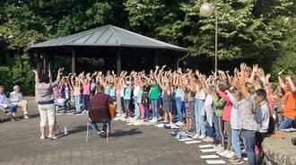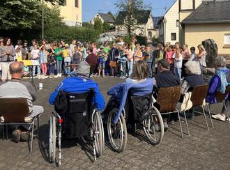 Die Kinder der zweiten, dritten und vierten Klassen versammelten sich um 9.30 Uhr auf dem Dorfplatz in Marienrachdorf, um allen Interessierten ein „Platzkonzert“ zu bieten. Beworben wurde dieses mit von den Schülerinnen und Schülern im Vorfeld bunt gebastelten Plakaten, die die Kinder einige Tage vorher im Ort verteilten. Auch zahlreiche Bewohner des Hauses Pusch folgten der Einladung und fanden sich am Dorfplatz ein, um den mit Begeisterung vorgetragenen Lieblingsliedern der Grundschulkinder zu lauschen.