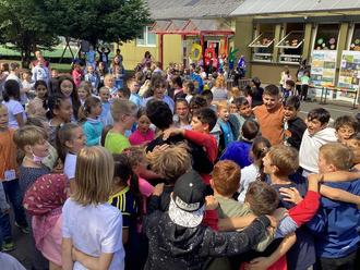 Als die letzten Töne des Westerwald-Liedes erklungen waren, tauchten aus der großen Masse an Kindern fünf große, bunte Buchstaben auf: D-A-N-K-E! - Was folgte, war ein Danke-Lied der Westerwälder Band „Ground44“, das für Frau Dehen-Rummel umgeschrieben und neu eingesungen worden war: „Wir woll´n dir DANKE sagen, denn du warst für uns da: morgens, mittags, ganz egal - einfach das ganze Jahr. Wir woll´n dir DANKE sagen und wünschen dir viel Glück! Wir hoffen, du denkst ab und zu nochmal an uns zurück!“ - Den Refrain kannten alle Kinder aus dem Effeff, hatten sie doch in den Wochen zuvor heimlich hinter den Klassentüren das besondere Lied für „ihre“ Frau Rummel geübt. Im Gesangstaumel formierte sich eine große „Kinder-Traube“ um die scheidende Schulleitung. So sangen sie gemeinsam: „Vor ein paar Jahren bist du hergekommen und du hast hier das Ruder übernommen. Viel zu tun gab es für dich. Doch diese Challenge hast du angenommen: mit Temperament und Herzlichkeit, mal mit Ruhe und mal laut, aber jederzeit bereit! (…) Dann kam‘ Corona, Tests und Masken, hunderte Regeln im Jahreslauf. Aber zusammen haben wir´s gemeistert, denn du gabst niemals auf!“