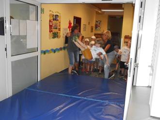 Dann war die Zeit für den Abschied gekommen. Im Kindergartenhof erwarteten uns schon die Eltern, die wir mit einem Lied begrüßten. Mit dem Spruch: „Fenster und Türen aufgerissen……“ wurde jeder Seniorfloh aus dem Kindergarten geschmissen und von den Eltern in Empfang genommen.