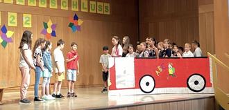 Die Reise durch die ersten vier Schuljahre glich demnach einer gemeinsamen Busreise, an deren Ende der Übergang zur neuen „Linie 5“ steht. Die Kinder thematisierten in dem Stück, an einer Bushaltestelle wartend, die vergangene - gemeinsam verbrachte - Zeit. Sie stellten fest, dass sie nicht nur den Schulstoff gelernt haben, sondern auch viele Dinge, die fürs Leben wichtig sind. Mit Mut und Zuversicht blicken sie so in die noch etwas unbekannte Zukunft. Zum großen Finale sangen alle Viertklässlerinnen und Viertklässler die Rockhymne „Tage wie diese“ von den Toten Hosen gemeinsam vor und auf der Bühne.