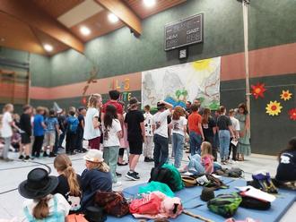 Nach der Begrüßung folgte ein besonderes Highlight der Feier: Die symbolische Bergwanderung, die die Schüler gemeinsam unternahmen. Ausgestattet mit kleinen Rucksäcken, die Erinnerungen und Wünsche für die Zukunft enthielten, machten sie sich auf den Weg, die erste Etappe des Berges zu erklimmen. Diese musikalische Wanderung stand sinnbildlich für den gemeinsamen Weg, den die Klassen in den letzten Jahren zurückgelegt, und die Herausforderungen, die sie gemeinsam gemeistert haben.