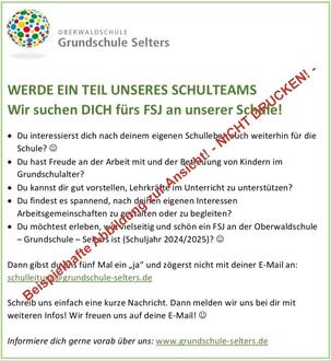 Du möchtest erleben, wie vielseitig und schön ein FSJ an der Oberwaldschule - Grundschule - Selters ist (Schuljahr 2024/2025)? :-)
