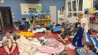Am Donnerstag, dem 26.06.2025, war es endlich so weit: Die Klasse 4c hatte ihre langersehnte Abschlussübernachtung in der Schule. Nachdem um 18.00 Uhr die Schlafplätze im Klassenzimmer eingerichtet waren, gab es erst ein mal für alle leckere Pizza.