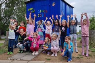 Die Dinos 2022 haben mit ihren Eltern ein Bauwagen-Projekt gestaltet, dessen Ergebnis sich nun auf dem Spielplatz des Kindergartens präsentiert.