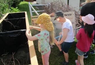 Mit Eifer füllen die Kinder die Schicht mit Reisig in das neue Hochbeet. Jetzt darf gepflanzt werden was noch bis zum Herbst gedeiht