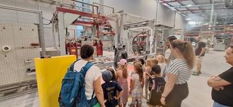 Im Anschluss sind wir in die Produktionshallen. Hier funktionieren die meisten Arbeitsschritte vollautomatisch. Spülbecken und Waschbecken werden 24 Stunden am Tag hergestellt. Wir konnten sogar zwei Roboter im blauen Anzug beobachten, die rund um die Uhr fertig gegossene Waschbecken lackieren. Das war für die Kinder sehr spannend und es gab viele Fragen zu klären.