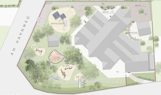 Diese werden nach der Installation einer neuen Oberflächenentwässerung durch eine Pflasterfläche ersetzt. Die größte Baumaßnahme wird jedoch die Errichtung einer behindertengerechten Zuwegung sein. Von dem westlich gelegenen Doppelflügeltor aus soll auf dem Grenzverlauf eine L-Steinwand mit einer gepflasterten Rampe entstehen, die es ermöglicht, mit einem Rollstuhl oder Kinderwagen ins Gebäude zu gelangen. Im weiteren Verlauf der Grenze wird die Stützwand aufgeschüttet und ebenfalls gepflastert, damit der hintere Bereich mitgenutzt werden kann. Dadurch entfällt der schwer zu pflegende Hang, was besonders unsere Gemeindearbeiter freuen dürfte. Insgesamt werden durch die Baumaßnahmen ca. 300 qm mehr nutzbare Fläche gewonnen. Es entstehen ein Outdoor-Theater und eine Erzählecke, um bei schönem Wetter die pädagogische Arbeit auch an der frischen Luft durchführen zu können.