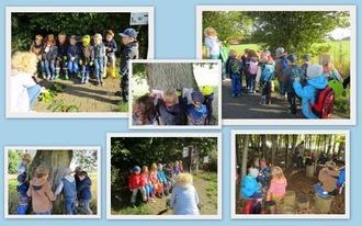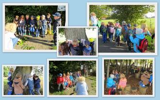 Gemeinsam mit Frau Schweizer-Waser (Ernährungsfachkraft & Diplom Oecotrophologin im Rahmen der Gesundheitspartnerschaft der AOK) entdecken die Dinos (Schulanfänger 2023) Gräser, Früchte und Kräuter am Wegesrand. Und weil in diesem Jahr einige Kräuter mit der Trockenheit zu kämpfen hatten, kann Frau Schweizer-Waser diese aus ihrer Kräuterkiste ergänzen. Wir dürfen z.B. Kapuzinerkresse kennenlernen oder den Duft von Lavendel und anderen Pflanzen riechen den sie abgeben, sowie die Blätter der Kräuter fühlen. Auch eine Waldschatzkarte mit Aufgaben wird gelöst. Wir haben gelernt, dass man die Pflanzen mit einer kleinen Schere abschneiden kann, um ihre Wurzeln zu schützen und sie nicht auszureißen.