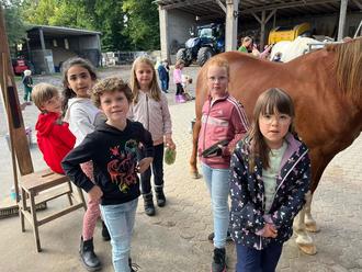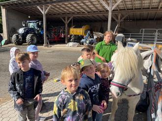 Auf dem Weiherhof angekommen, wartete ein abwechslungsreiches Programm auf die Kids. In Gruppen durften sie die Pferde striegeln und sogar mit abwaschbarer Farbe bunt bemalen - ein riesiger Spaß! Bei einer spannenden Hofrallye lernten sie die verschiedenen Bereiche des Hofs kennen und erfuhren viel über die landwirtschaftlichen Maschinen. Besonders aufregend war es, einmal selbst auf einem Traktor zu sitzen.