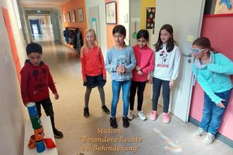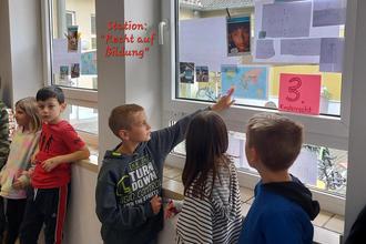 Vorbereitet und durchgeführt wurden die einzelnen Stationen von den Klassen selbst, die sich nun gegenseitig besuchten und informierten. Damit das gelingen konnte, ging zunächst die eine Hälfte der Klasse auf Entdeckungstour, während die andere Klassenhälfte den vorbeikommenden jungen Besucher*innen ihre Station zu einem der Kinderrechte näherbrachte.