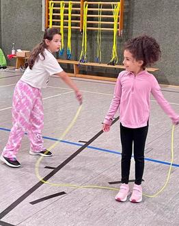 Unter der Anleitung von Workshopleiterin, Frau Alexandra Stähler-Quast, lernten und übten die Kinder zwei Schulstunden lang zahlreiche Einzel-, Partner- und Gruppen-Sprungvariationen beim Seilspringen.