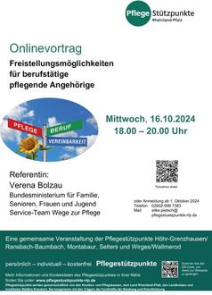 Zu diesem Thema haben die Pflegestützpunkte im unteren Westerwald Verena Bolzau vom Pflegetelefon des Bundesministeriums für Familie, Senioren, Frauen und Jugend eingeladen. Am Mittwoch, dem 16. Oktober von 18.00 bis 20.00 Uhr wird sie in einem Onlinevortrag über Freistellungsmöglichkeiten für berufstätige pflegende Angehörige informieren.