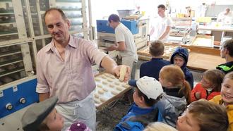 Die Klassen konnten beobachten, wie aus Mehl, Margarine, Salz, Hefe und Wasser Brötchenteig produziert wird. Eine Maschine portioniert den Teig, formt längliche Brötchen und schneidet diese dann ein. Während sie im Backofen gebacken werden, werden die Brötchen mit Wasser besprüht, damit sie schön knusprig werden. Außerdem zeigte uns Axel Haubrich, wie Plunder- und Blätterteig hergestellt werden. Aus Hefeteig durften die Schülerinnen und Schüler Mäuschen, Igel und Zöpfe formen. Zum Schluss bekam jedes Kind ein Schokobrötchen mit auf den Weg.