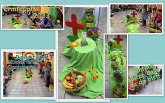 Mit ihren Fürbitten brachten die Kinder selbst Gaben zur Feier ein und dankten dafür, dass bei uns alle genug zu essen haben. Gemeinsam mit Swenja Müller haben die Kinder überlegt, für was man alles “Danke“ sagen kann und dies schließlich in Form einer Sonnenblume dargestellt. Vielen Dank allen Eltern für die zahlreichen Erntegaben und Swenja Müller für die Mitgestaltung unserer Feier.