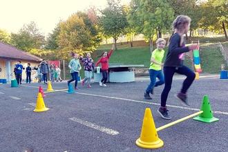 Für Abwechslung während des Laufens sorgten neben dem Plaudern mit den Laufpartner*innen verschiedene Laufaufgaben. So konnten die jungen Sportler*innen über Hindernisse laufen, Buchstaben verschiedener Wörter finden und ablaufen sowie verschiedene Laufarten ausprobieren. Auch für musikalische Unterhaltung und Anfeuerungsrufe war gesorgt. So waren alle Kinder mit Feuereifer dabei. Sogar die Erstklässler*innen zeigten schon beachtliche Laufleistungen.