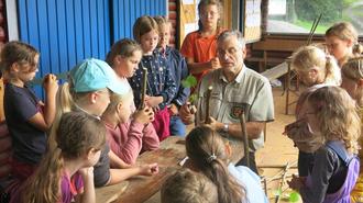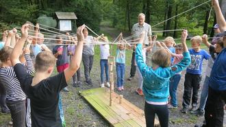 Highlight in dieser Hinsicht waren erwartungsgemäß der Bau von Pfeil und Bogen aus Haselruten, die zuvor selbst aus dem Wald geholt wurden. Ähnlich toll kam das Feuermachen am Abschlusstag an. Denn hierfür stand nur ein Feuerstahl zur Verfügung. Alles andere musste aus dem Wald geholt werden. Förster Frenzel hatte die nötigen Tipps und konnte so nebenbei auch Lebenspraktisches vermitteln. Das Feuer wurde dann zum Grillen der Wildwürste genutzt, was zum Abschluss der Woche die Eltern mit Mitgebrachtem zu einem gemeinsamen Abschlussbüffet ergänzten. Ein reger Austausch folgte und die Kinder konnten den Eltern vor Ort von dieser gelungenen Woche berichten und vor allem ihre liebevoll errichteten Laubhütten zeigen.