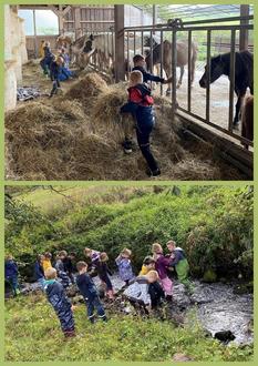 Am letzten Schultag vor den Ferien unternahm die Klasse 1b einen erlebnisreichen Ausflug zum Hof einer Mitschülerin nach Maxsain/Zürbach. Unmittelbar nach der Ankunft auf dem Hof begrüßte uns die Familie gemeinsam mit ihrem Hütehund Aika, der bereits nach kürzester Zeit die Herzen der Kinder erobert hatte. Majas Mama berichtete kurz von den verschiedenen Aufgaben, die am Morgen auf dem Hof anstehen und schon eilten die Kinder in den Stall, um die Schafe, Hühner und Kaninchen zu begrüßen. Sie halfen dabei, die Schafe auf die Weide zu bringen, fütterten die Tiere und beobachteten, wie „Herr Karnickel“ in sein Außengehege gesetzt wurde. Anschließend begrüßten sie die Ponys und kuschelten bereits mit dem Minishetty Daisy. Nach einem Picknick im Heu, durften die Kinder die Ponys mit verschiedenen Striegeln und Bürsten putzen und die Hufe auskratzen, bevor es auf den Reitplatz ging. Hier hatte jedes Kind die Möglichkeit, auf dem blanken Rücken der verschieden großen Ponys zu sitzen und sich ein paar Runden tragen zu lassen. Zum Abschluss unternahm die Klasse noch eine kleine Wanderung über die Weide zum Saynbach. Voller Tatendrang erkundeten die Kinder das Gewässer. Auch wenn nicht alle Füße trocken blieben, hatten die Kinder eine Menge Spaß.