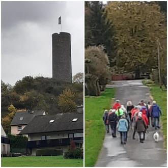Gewandert wurde vom Parkplatz an der Festhalle in einer großen Runde um Hartenfels. Dabei hatten die Wandernden die Burgruine Hartenfels immer im Blick und konnten aus verschiedenen Perspektiven das "Schmanddippe", wie man den noch erhaltenen Burgfried im Volksmund wegen der Ähnlichkeit mit einem Sahne-/Schmandtopf nennt, aufnehmen.
