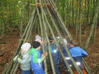 Alle freuen sich, dass sie den neuen „Feenweg“ laufen können und unterwegs neben bunten Stationen auch schon Früchte wie Haselnüsse und Eicheln finden. Nach der Stärkung mit einem leckeren Frühstück aus dem Rucksack auf dem Waldplatz der Sternschnuppen und Wirbelwinde geht es an die Arbeit mit dem Ziel: Wir bauen ein Tipi für die „Farbkleckse“, unsere Jüngsten. Und da wir ausreichend Material haben, bauen wir auch noch ein Tipi für die „Sternschnuppen“.