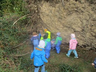 Der Wurzelteller zeigt, wie mächtig er ist und da er am Feenweg liegt, hat jemand kleine Wichtelhäuser dort aufgestellt. Bei sonnigem Herbstwetter geht es schließlich wieder zurück zum Kindergarten, wo alle von ihren Erlebnissen erzählen und sich auf den nächsten Besuch im Tipi freuen.