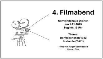 Die Gemeinde lädt herzlich zum 4. Filmabend am Samstag, dem 1. November, um 19.00 Uhr in die Gemeindehalle ein. Gezeigt werden Filme, welche das Dorfgeschehen der vergangenen 40 Jahre in eindrucksvollen Bildern dokumentieren. Die Veranstaltung bietet Gelegenheit, gemeinsame Erinnerungen aufleben zu lassen und den Wandel unseres Dorfes zu betrachten. Der Eintritt ist wie immer hierbei frei. Ein weiterer Filmabend zu dem Thema findet Anfang 2026 statt.