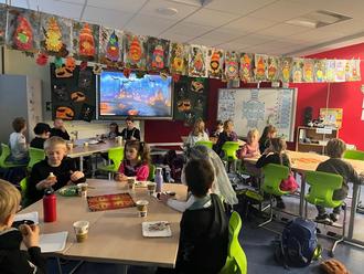 Gut gestärkt machten wir uns dann auf eine Halloween-Lesespur. Dabei mussten wir spannende Rätsel lösen und den richtigen Weg durch eine gruselige Geschichte finden. Alle waren mit Feuereifer dabei - schließlich wollte niemand in der Geisterfalle landen. Außerdem konnten noch Aufträge der Halloween-Werkstatt erledigt werden, sodass wir gar nicht mehr aus dem Gruseln herauskamen.