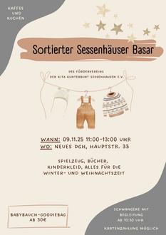Am Sonntag, dem 9. November, lädt der Förderverein der Kita Kunterbunt Sessenhausen e.V. von 11.00 bis 13.00 Uhr herzlich zum Sortierten Sessenhäuser Basar ins neue Dorfgemeinschaftshaus, Hauptstraße 33 ein.