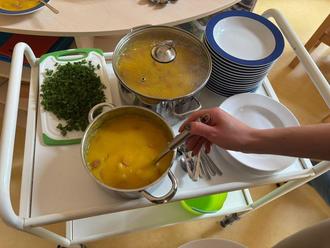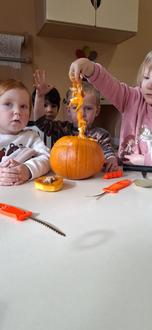 Natürlich durfte auch das leibliche Wohl nicht fehlen: Gemeinsam mit den Kindern hatten die Erzieherinnen zuvor Kürbisse ausgehöhlt und geschnitzt, und aus dem Fruchtfleisch entstand am Festtag eine köstliche, frisch gekochte Kürbissuppe. Dazu gab es kleine Snacks, Obst, Saft und Musik, die perfekte Mischung für eine ausgelassene Halloween-Stimmung.