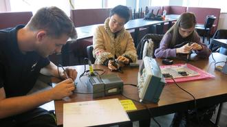 Der vierte Tag wurde richtig praktisch: Der Ausbildungsleiter Martin Meyer mit zwei Auszubildenden von der Firma EWM aus Mündersbach, einem der Marktführer für elektrische Schweißgeräte, führte die Teilnehmenden in die Geheimnisse der Elektronik und des praktischen Lötens ein.