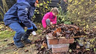 Mit Eimern voller Blätter und kleinen Schaufeln machten sie sich ans Werk. Stein für Stein entstand ein Igelhäuschen, das sie anschließend mit Laub und Zweigen bedeckten.