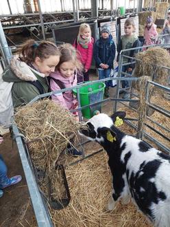 Nach einem kurzen Spaziergang zum Hof wurden Frau Berwanger, Frau Schönberger, Frau Dasbach und Frau Orak mit ihren Schützlingen schon von Bauer Dominik erwartet. Er erläuterte ihnen zunächst einige wichtige Dinge bezüglich seines Bauernhofs, bevor sie dann auch schon die neugeborenen Kälbchen zur Freude aller Kinder begrüßen durften. Danach ging es weiter in den Kuhstall, wo den Schülerinnen und Schülern genau gezeigt wurde wie die Kühe gemolken werden. Sehr beeindruckend, wie viel Milch eine einzige Kuh gibt!