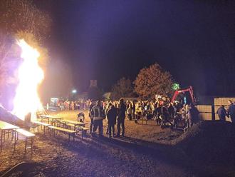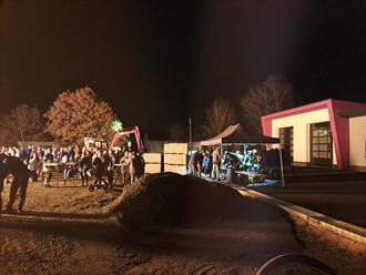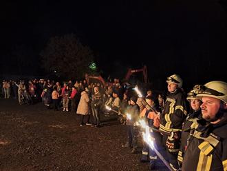 Danach ging es, angeführt von der Feuerwehr und St. Martin (Vanessa mit Paco) und unter musikalischer Begleitung durch die Maxsainer Blaskapelle durch den Ort zum Festplatz. Dort wurden wir von dem leuchtenden Martinsfeuer erwartet.