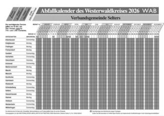 Bestimmt haben Sie ihn schon gefunden, oder? Diesem Heft ist der neue Abfallkalender des Westerwaldkreis-AbfallwirtschaftsBetriebes (WAB) für das Jahr 2026 beigelegt. Der Innenteil des Abfallkalenders enthält wie gewohnt ausführliche Informationen über das Abfuhrsystem im Westerwaldkreis. Neben der genauen Beschreibung der wöchentlichen Abfuhr sind hier auch Infos zur Kühlschrank-, Elektroaltgeräte-, Wertstoffschrott- und Sonderabfallentsorgung sowie nähere Erläuterungen zur Sperrabfall- und Grünabfallentsorgung aufgeführt.