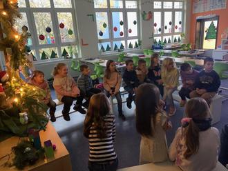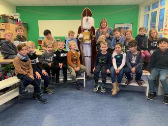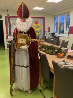 Am Dienstag, 6. Dezember brachte der Nikolaus die Augen unserer Schüler zum Strahlen, als er die Klassen mit seinem goldenen Buch und dem Bischofsstab betrat. Zur Freude aller überbrachte er kleine Geschenke, nachdem er den Schülern aus dem großen goldenen Buch von den guten und auch weniger guten Taten vorlas. Gespannt hörten sie ihm zu und waren heilfroh, dass er Knecht Ruprecht nicht mitgebracht hatte.