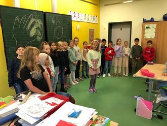 Beim ersten Mal lernten die Kleinen das englische Begrüßungslied, das sie schon von ihrer Einschulung her kannten. In der nächsten Patenstunde lernten dann die Großen etwas von den Kleinen, da die Erstklässler den Drittklässlern ihren morgendlichen Begrüßungsspruch vorstellten. Beim letzten Treffen trugen die großen Kinder dann schließlich stolz ihre Herbstgedichte vor.