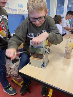 Zuerst versuchten sie, Getreidekörner mit verschiedenen Dingen wie z.B. mit einem Hammer, einem Stein und einem Mörser zu mahlen. Das war ganz schön schwer! Im Anschluss wurden die Klassen in je drei Gruppen aufgeteilt. Zwei Gruppen mahlten mit einer Getreidemühle Weizenvollkornmehl. Anschließend fügten sie noch einige Zutaten hinzu, um einen leckeren Waffelteig zu zaubern.